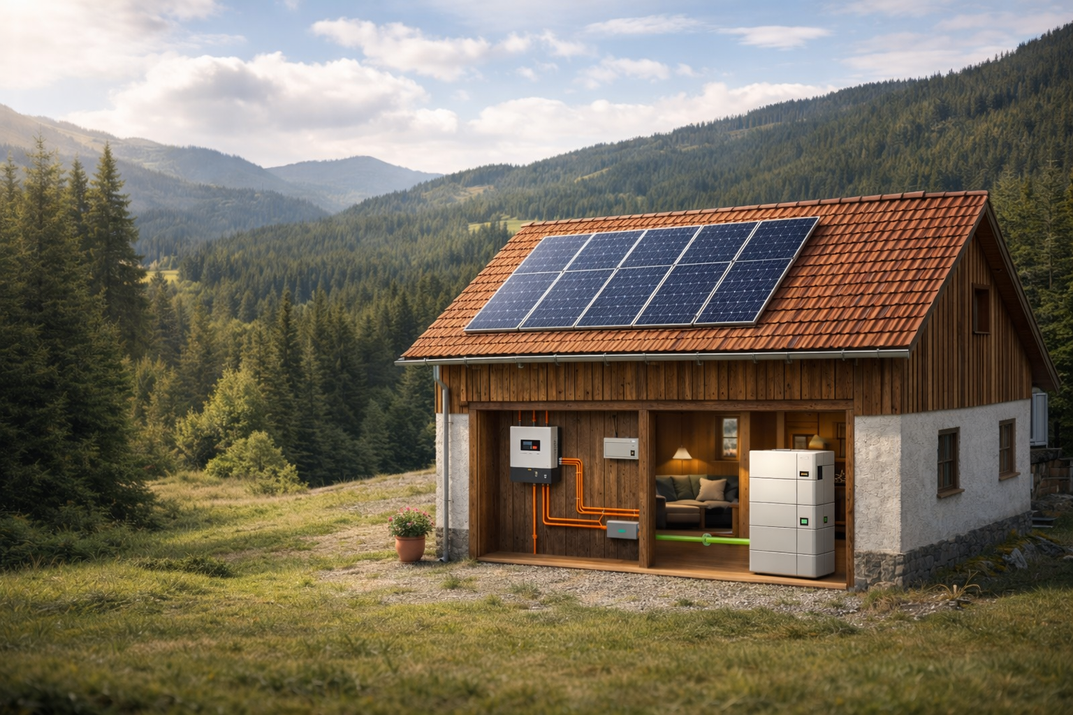 Navrhneme a dodáme ostrovní systém, který funguje zcela nezávisle na distribuční síti. Řešení je vhodné pro chaty, chalupy i objekty v odlehlých lokalitách bez elektrické přípojky.