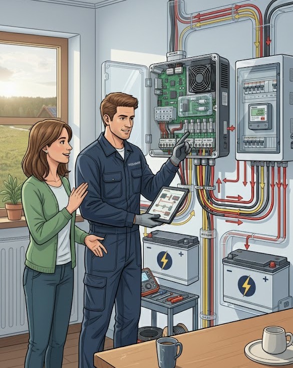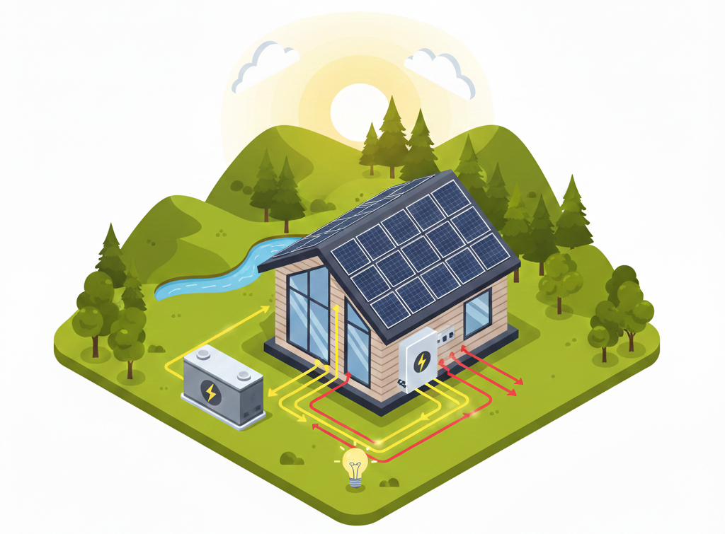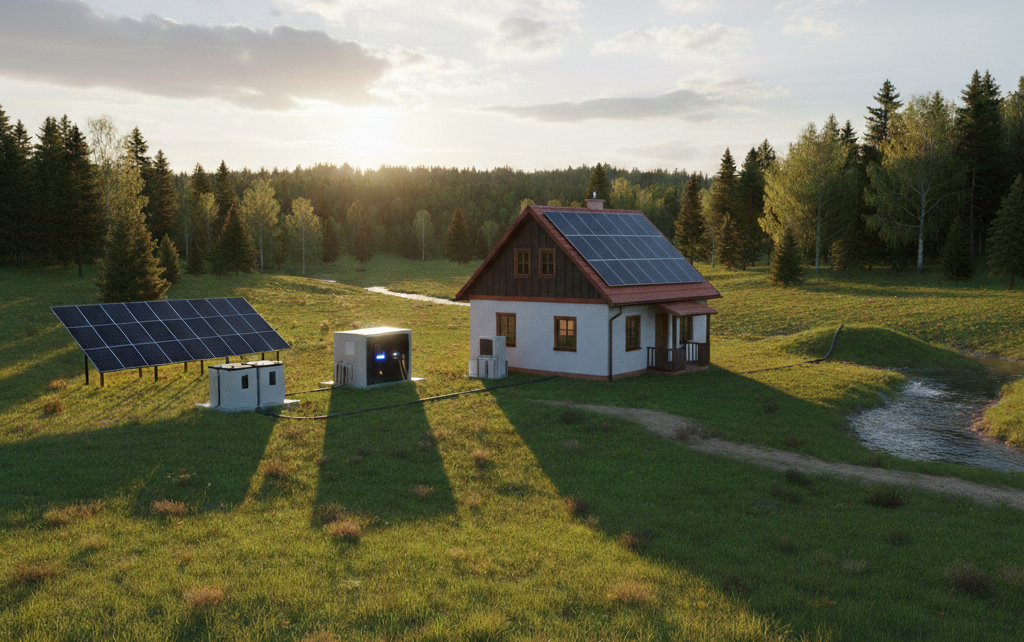 Systém vyrábí elektřinu ze solárních panelů, ukládá ji do bateriového úložiště a umožňuje její využití kdykoliv během dne i noci – zcela bez napojení na síť.